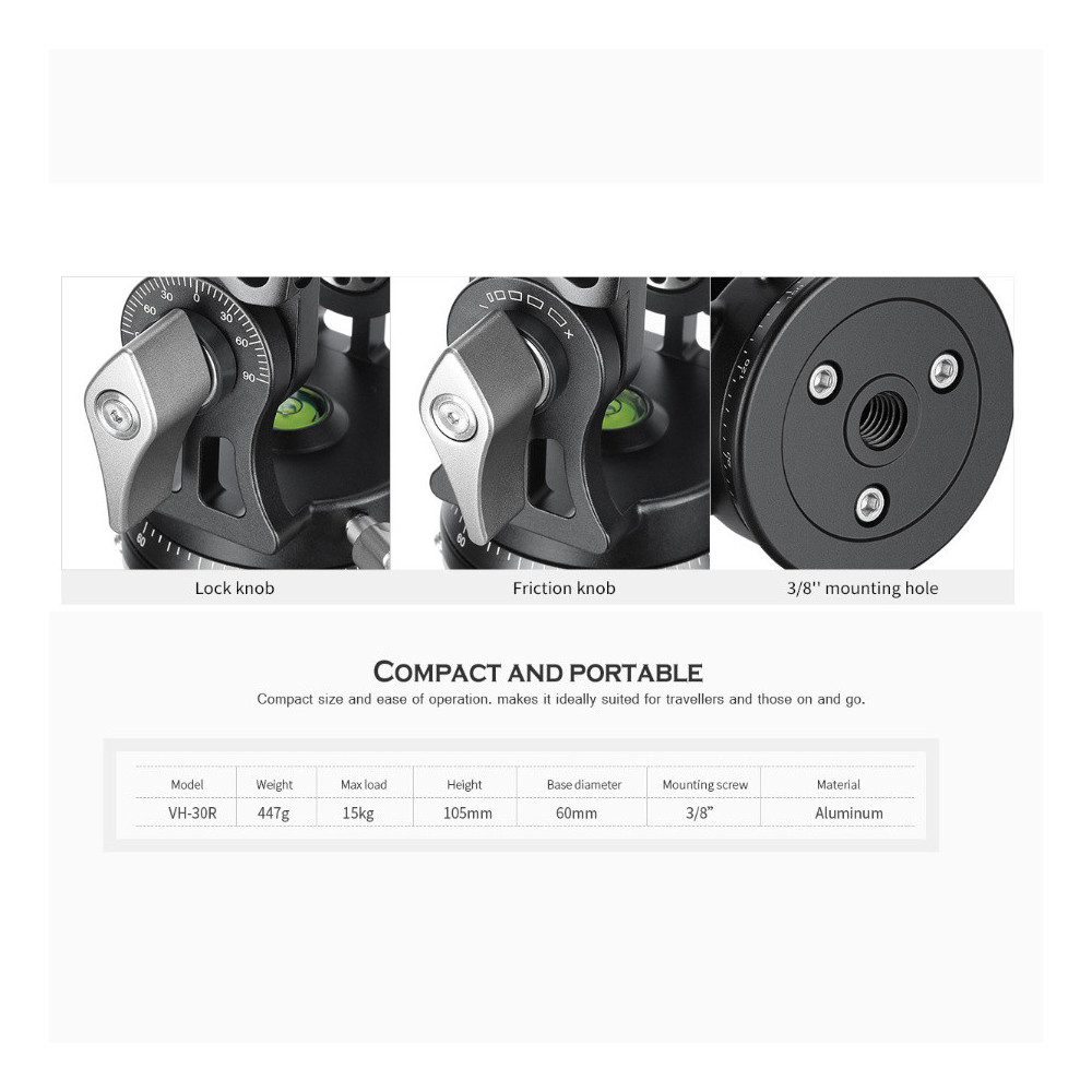 Hlava VH-30R je robustní hlava pro monopody a zároveň ideální volbou pro birdwatching. Tuhost pohybu a pohyblivost ve vertikální směru se nastavuje dvěma samostatnými ovládacími prvky. Hlava je sklopitelná o 90°ve dvou směrech. Pro přesnou kontrolu je k dispozici škála náklonu.