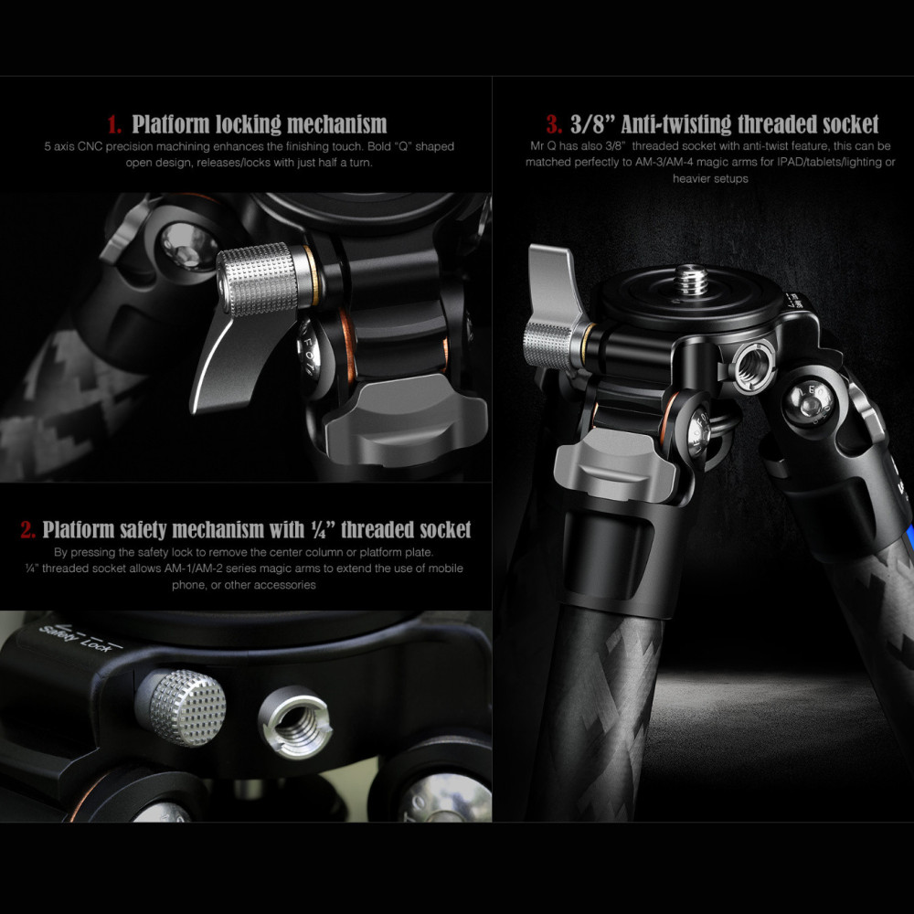 Stativová série Mr.Q je vrcholem evoluce stativů Leofoto v roce 2020. Ve své konstrukci nabízí kombinaci kompaktních rozměrů a vysoké užitkové vlastnosti série Leofoto Ranger a navíc přináší možnost integrace středového sloupku podobným mechanismem, jaký využívá série Leofoto Summit. Jednoduchým odjištěním a uvolněním mechanismu je možné sloupek buďto nasadit, anebo odstranit. Fotograf má tedy v případě Mr.Q možnost volit rovnou platformu stativu pod stativovou hlavou, anebo stativovou hlavu namontovat na středový sloupek. Systém montáže je prověřen, je rychlý, funkční a robustní.