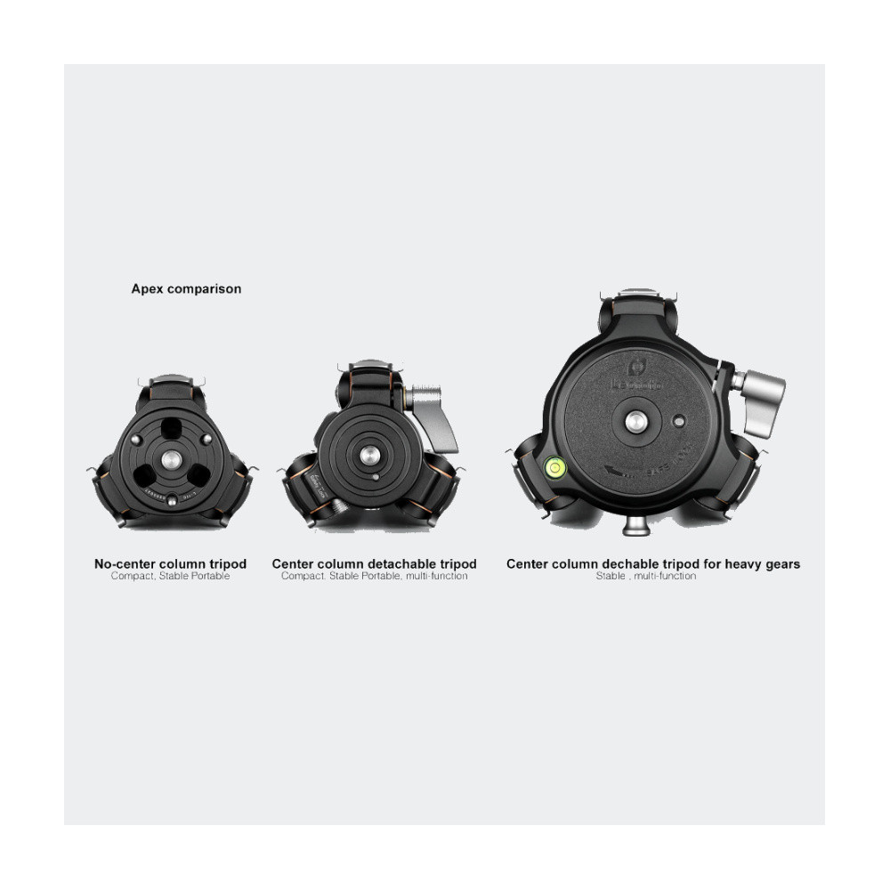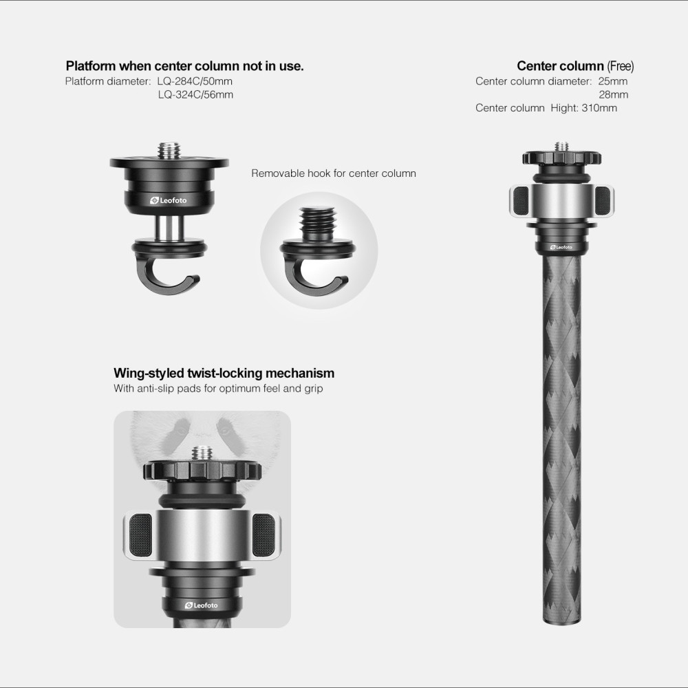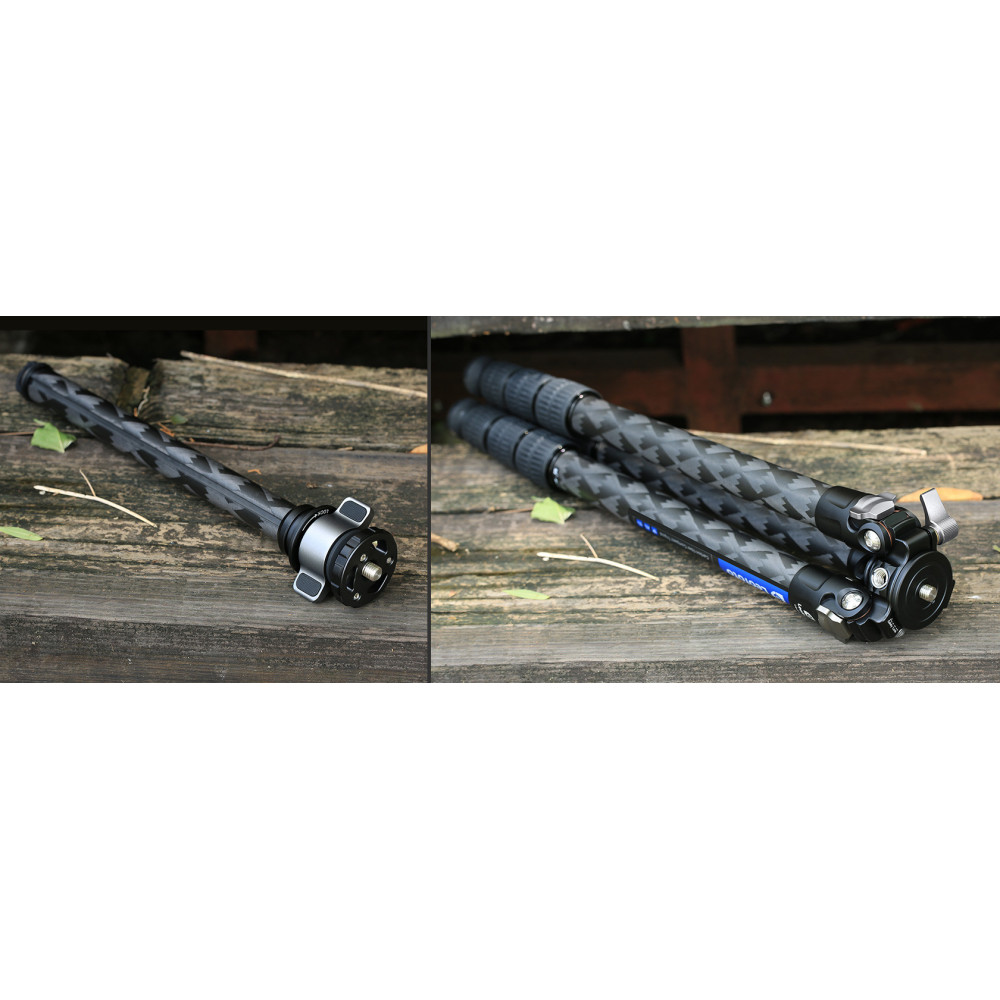 Minimální pracovní výška stativu LQ-324C je 165 mm nad zemí – stativ je tak ideální volba pro makrofotografy. Každá stativová noha se skládá ze čtyř segmentů, mají průměry 32, 28, 25 a 22 mm.