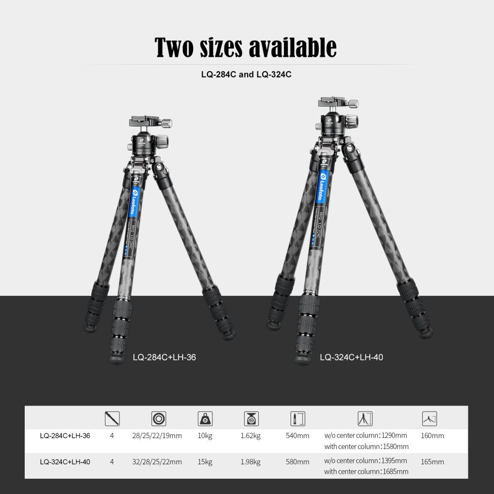Také tento model je, stejně jako všechny stativy řady Mr.Q je navržen tak, aby doprovázel fotografy na delších cestách ve volné přírodě. Lehký, kompaktní a přesto mimořádně robustný a silný: všechny atributy, které jsou také součástí standardu karbonového stativu Leofoto Mr.Q LQ-324C. Transportní velikost sestavy je 580 mm. Po úplném vytažení nožních segmentů a středového sloupku lze i díky hlavě Leofoto LH-40 dosáhnout maximální pracovní výšky 1685 mm. Balení obsahuje středový sloupek, hroty z nerezavějící oceli a také víceúčelový nástroj - vše je dodáváno společně s taškou. S vlastní váhou stativu pouhých 1980 g a hlavy 540 g sestava přispívá k tomu, že vybavení je velmi lehké. Nosnost sestavy je 15 kg.