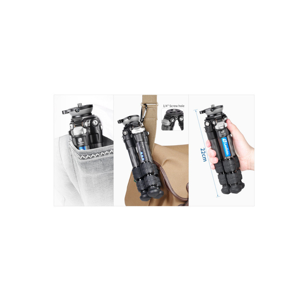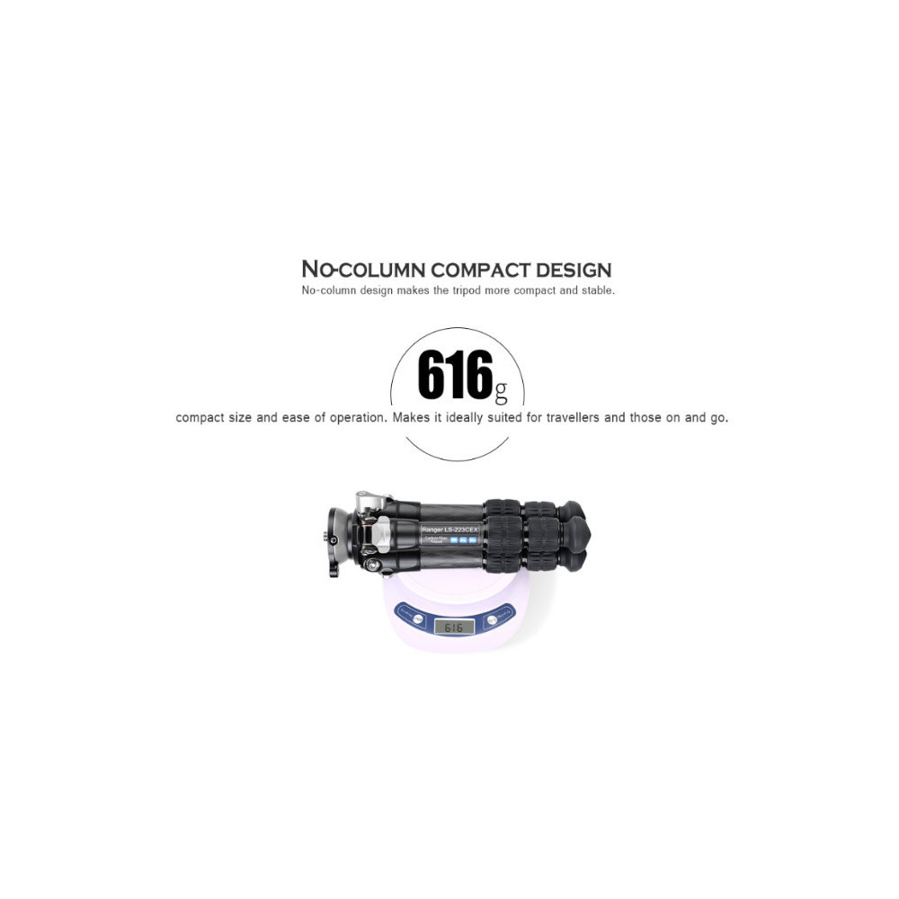Maximální nosnost stativu je 5 kg. To je ideální pro bezzrcadlovku, anebo pro DSLR s menším až středním teleobjektivem. Celá sestava je extrémně lehká. Karbonový stativ LS-223CEX váží 610 g. Je tedy dokonalým příslušenstvím pro cestování, třeba i do větší kapsy.