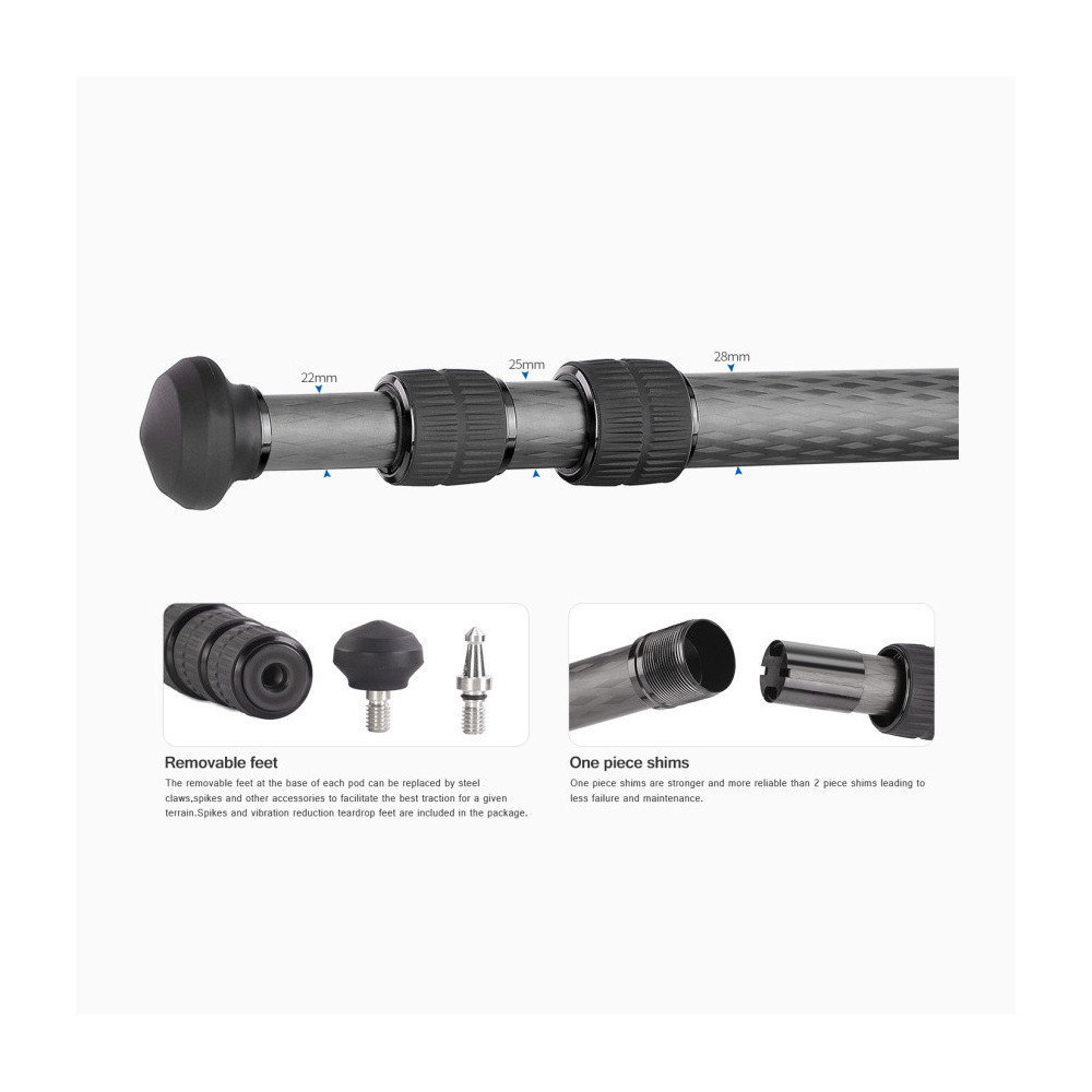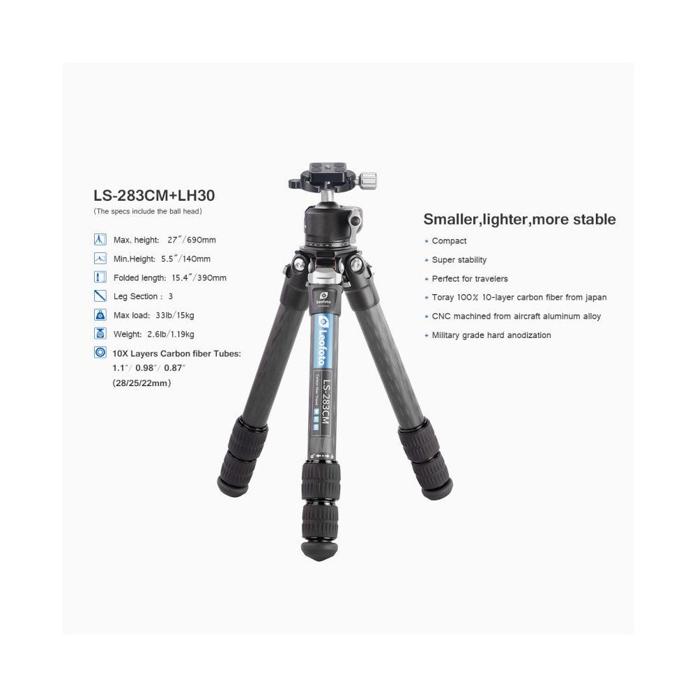 Transportní velikost sestavy je 390 mm. Po úplném vytažení nožních segmentů lze pomocí hlavy Leofoto LH-30 dosáhnout maximální pracovní výšky 690 mm. Perfektně zapadne do lehké batožiny do letadla, nebo se může stát stabilní součástí fotobaťohu. S vlastní váhou stativu pouhých 1190 g nebude na přítěž a naopak, už nikdy nebudete muset říct "měl jsem si přece jenom vzít stativ"... Nosnost stativu je 15 kg. Každá stativová noha se skládá ze tří segmentů, které mají průměry 28, 25 a 22 mm.
