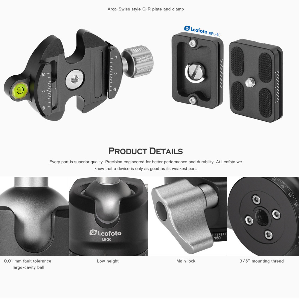 Vyrobena na CNC frézách, z černého eloxovaného leteckého hliníku, se zabudovanou libelou. Horizontální otáčení 360 ° a vertikální náklon až o 90 ° kulového kloubu jsou řízeny a drženy dvěma samostatnýma maticema. Při hmotnosti pouhých 308 g zvládá kulová hlava Leofoto LH-30 zatížení až 15 kg. Výška 80 mm znamená, že těžiště je nízce položené a pomáhá snižovat nepříznivé vibrace. Základna hlavy je opatřena stativovým závitem 3/8 " a číselnou škálou, což usnadňuje přesné nastavení polohy hlavy. Rychleupínací destička hlavy je kompatibilní se standardem Arca-swiss.