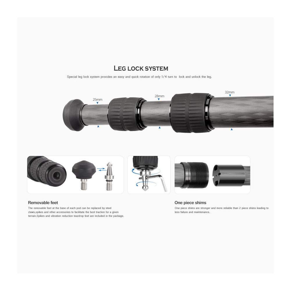 Výkonný karbonový stativ ze série Leofoto Summit s nosností 25 kg. Stativ Leofoto Summit LM-323C je třísekční stativ vhodný i pro stabilizaci větších fotoaparátů s dlouhými teleobjektivy. Transportní velikost stativu je 610 cm, maximální pracovní výška je 1400 mm. Ve vrchní části stativu je pevně osazená libela. Součástí balení je taška, stativ, víceúčelový montážní nástroj a sada hrotů z nerezavějící oceli. Nosnost stativu je 25 kg.