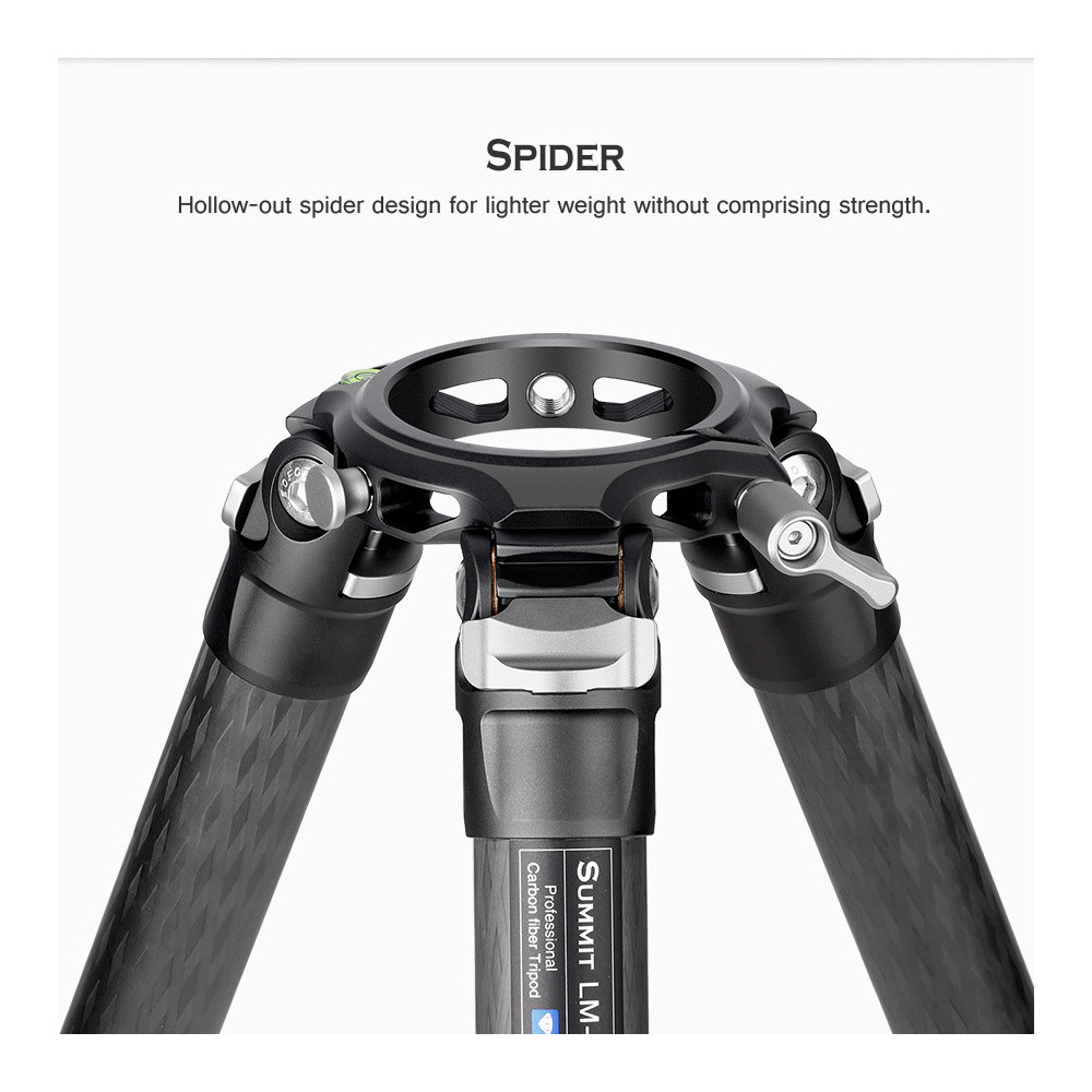 Hned v úvodu popisu vlastností nové série stativů Summit je nutno podotknout, že Summit je „něco mezi Rangerem a Mountainem“. Biolog by podle vzhledu odhadl původ jako výsledek úspěšného křížení Leofoto Ranger a Leofoto Mountain. No a samozřejmě, od každého Summit zdědil pouze to nejlepší. Pevné a silné nohy z 10-ti vrstev karbonu má od Rangera a vrchní platformu z hliníku s důmyslným systémem pro výměnu platforem přebral a vylepšil ze stativu Mountain. Nohy nového modelu Summit se napojují na vrchní platformu přes mosazné „samomazné“ distanční destičky, takže nehrozí zadření pohybu nohou.