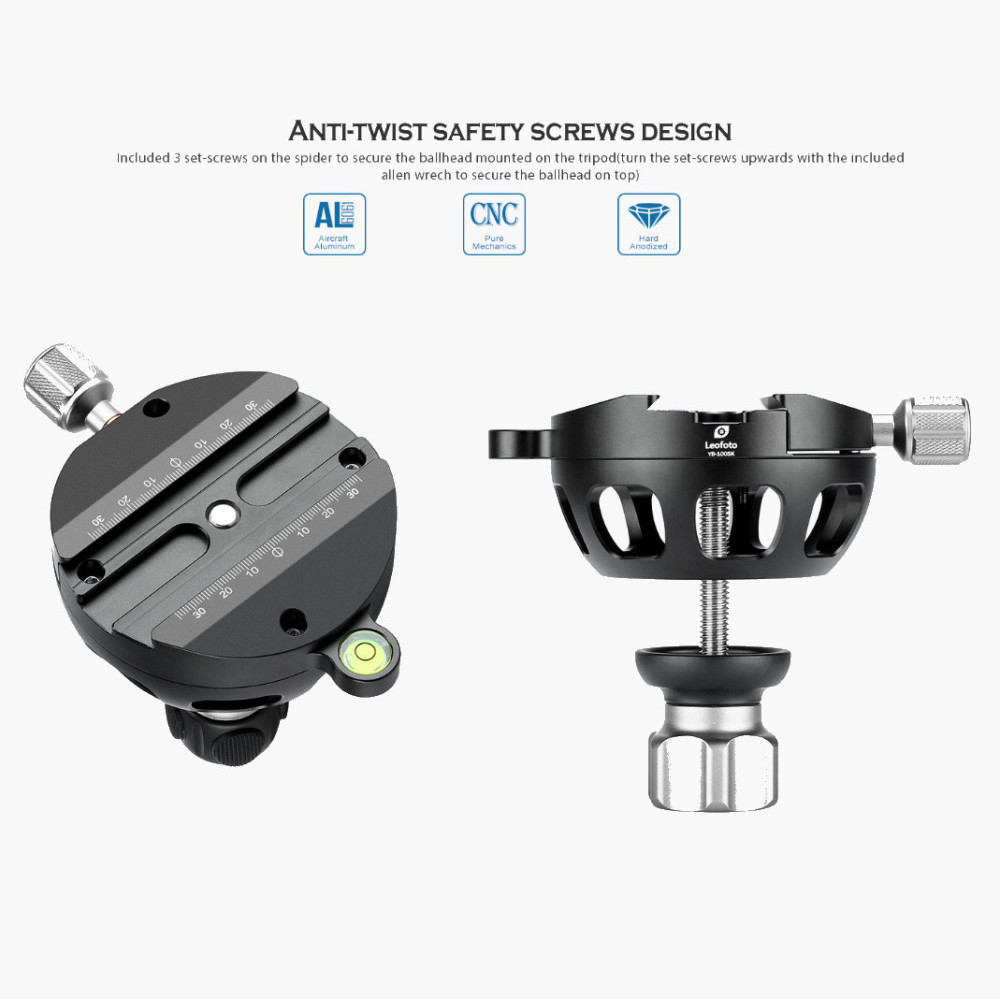 Půlkulový adaptér Leofoto 100 mm slouží jako spojovací část mezi stativem a fotoaparátem s destičkou. Jeho horní část umožňuje uchycení Arca-Swiss destičky se šroubovacím systémem fixace destičky.