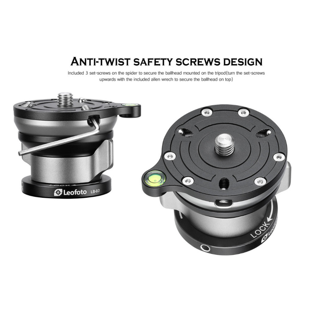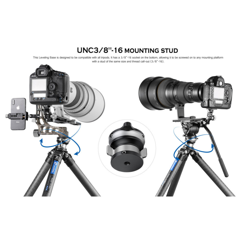 Vyrovnávací nivelační "hlava", resp. základna Leofoto uživateli umožní nastavení přesného horizontu při snímání. Vhodná je jak pro fotoaparát, tak videokameru. Maximální zatížení podložky je až 18kg. Na stativ se montuje na foto-šroub stativu velikosti 3/8". Opačná strana je ukončené foto-šroubem 3/8". Součástí balení je i adaptér na šroub 1/4" na 3/8".