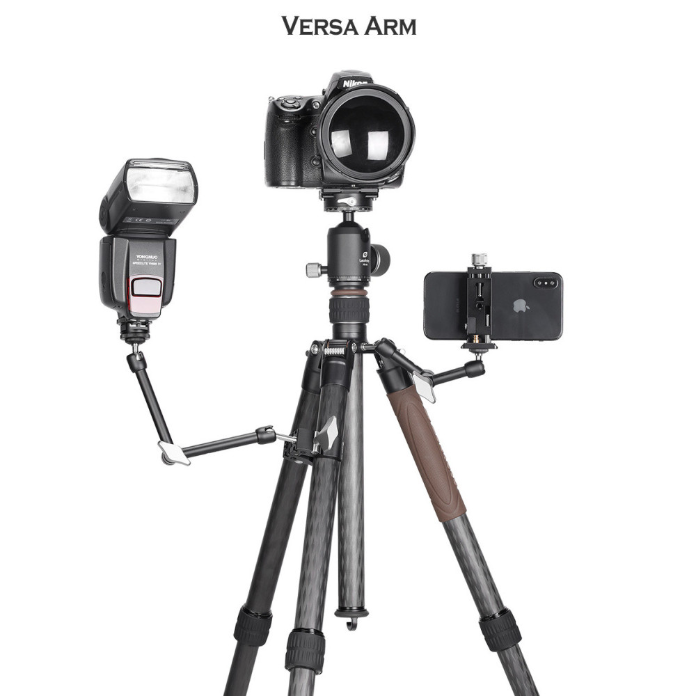 Na svorku Leofoto MC-100 můžete upevnit množství příslušenství. MC-100 má dostatečnou sílu, aby to všechno udržela. Na fotce s kulovou hlavou LH-25, rameny AM-4 a AM-4Kit, LED světlem Aputure, mobilním telefonem a Nikonem Z 6 s nasazeným objektivem Nikkor Z 35 mm f/1,8 S.