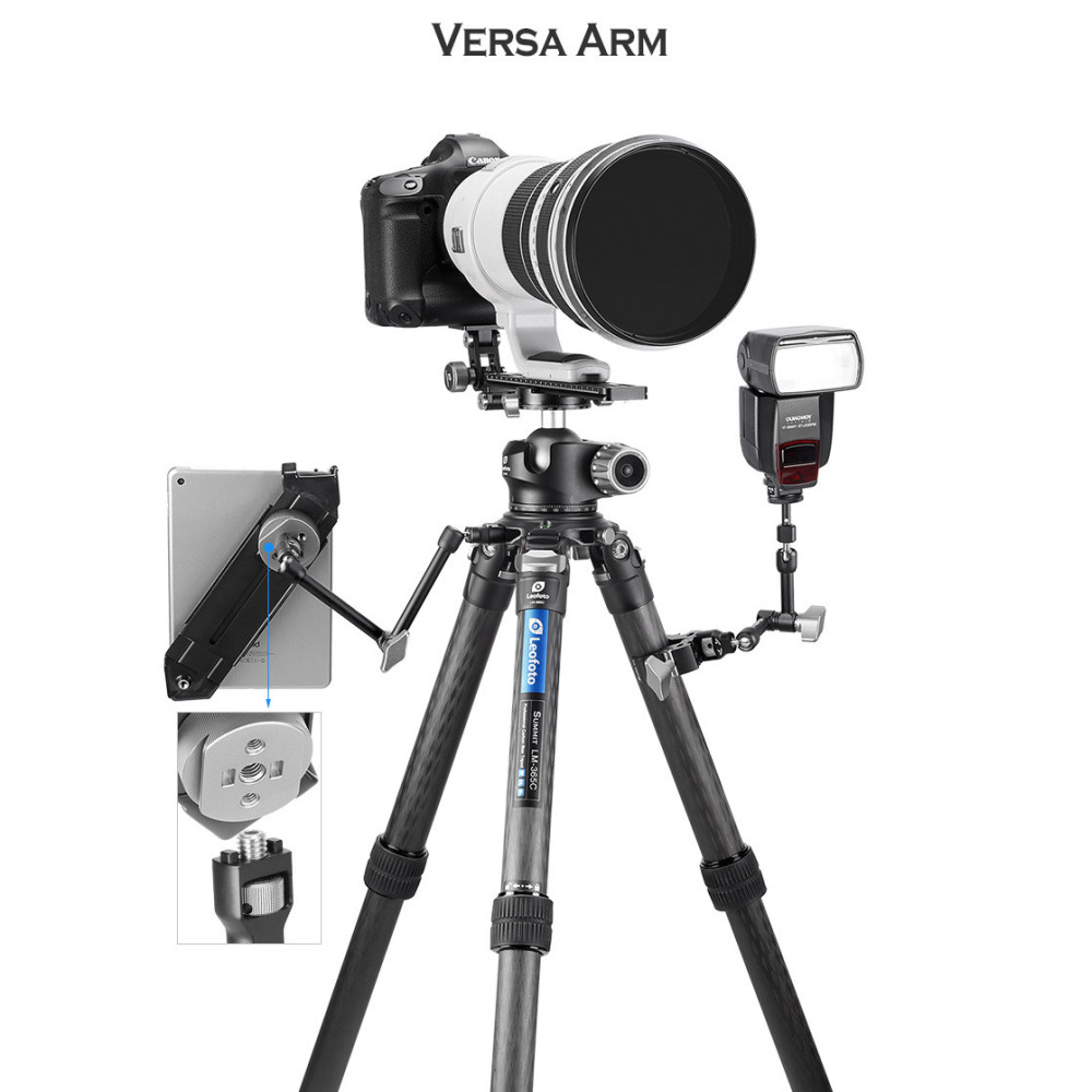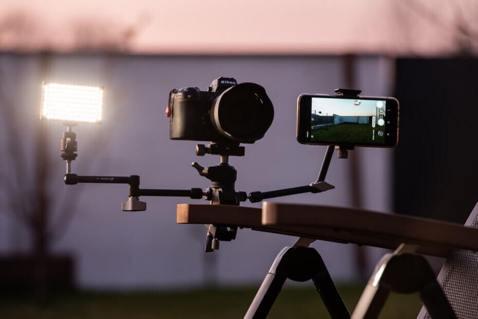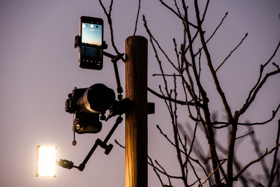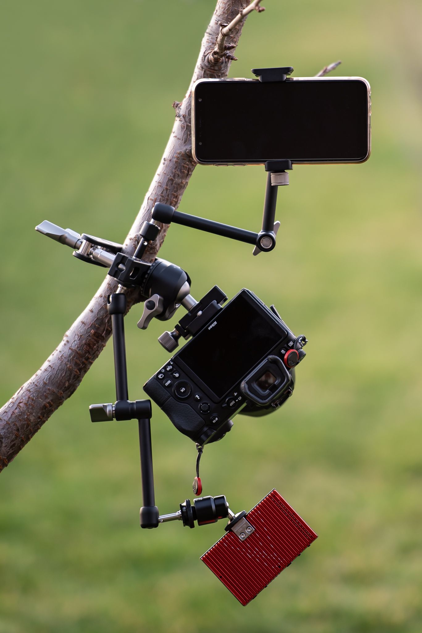 Na svorku Leofoto MC-100 můžete upevnit množství příslušenství. MC-100 má dostatečnou sílu, aby to všechno udržela. Na fotce s kulovou hlavou LH-25, rameny AM-4 a AM-4Kit, LED světlem Aputure, mobilním telefonem a Nikonem Z 6 s nasazeným objektivem Nikkor Z 35 mm f/1,8 S.