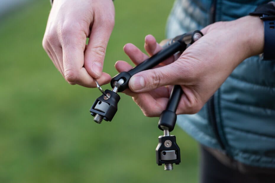 To má na svých koncích šrouby s otvory pro dotáhnutí imbusákem, ale okolo nich dokonce jakousi objímku s pojistkami proti přetočení. Jsou to dva výčnělky, které přesně zapadnou do vybraných míst na svorkách a zabrání nechtěnému uvolnění ramena.