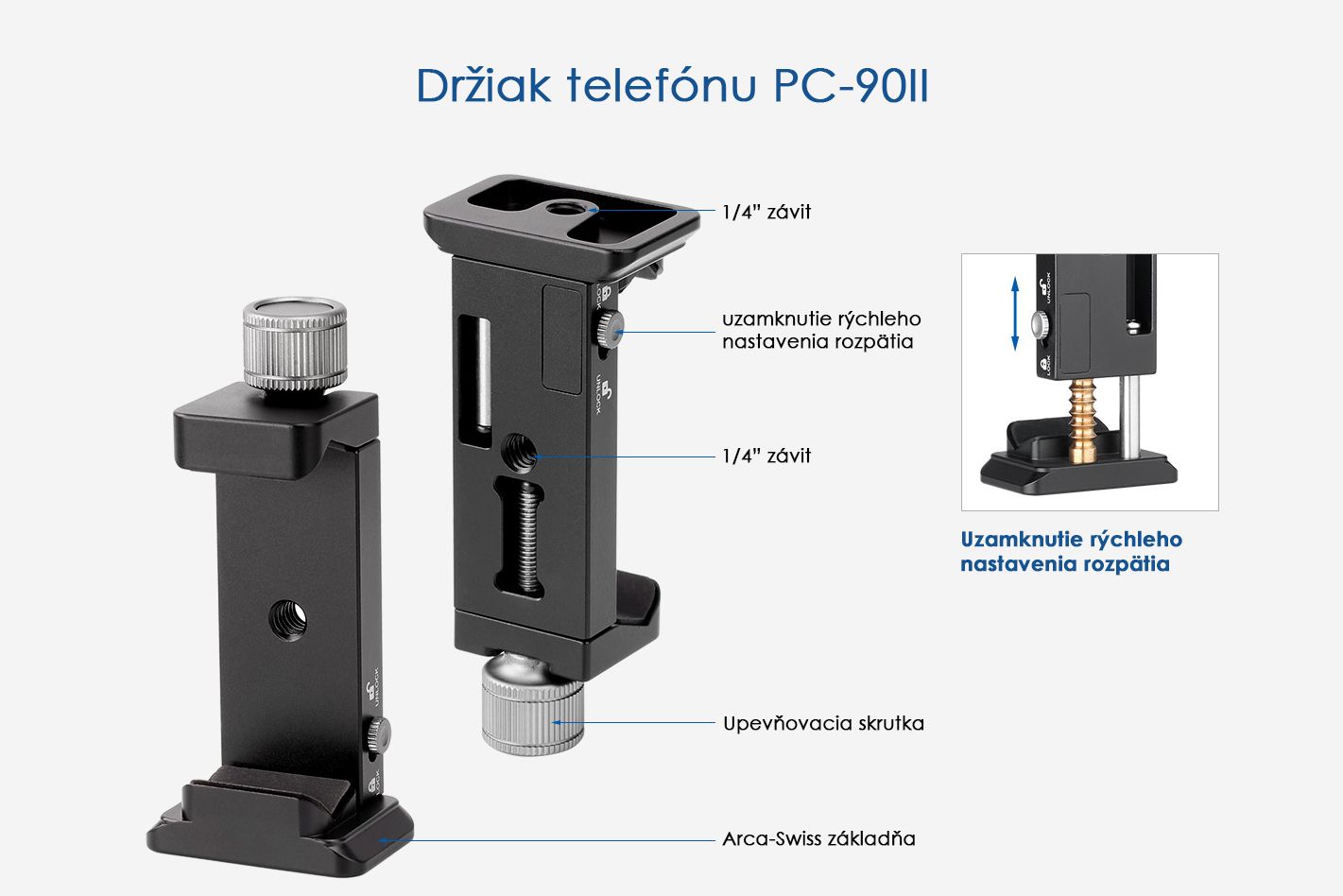 Dnes není nic divného, že s fotoaparáty používáme mobil ať už pomocí něho fotoaparát ovládáme anebo používáme jako druhý monitor v případě, že fotoaparát nemá vyklopitelný displej. PC-90II má páčku s aretací na rychlé přizpůsobení rozevíratelnosti ramen a potom šroub s jemným chodem na finální aretaci mobilu v držáku. Držák je opatřený dvěma otvory s 1/4“ závitem a zároveň na jedné straně adaptérem Arca Swiss. Držák tak nemusíte upevnit jen na svorku, ale můžete ho vložit namísto rychloupínací destičky rovnou do kompatibilní hlavy. Genialně jednoduché řešení. Já jsem si už vymyslel, jak mi tento držák bude sloužit na uchycení mobilu na motorku. ???? Musíte jen dát pozor na to, aby jste stále zajistili pojistku rychlého přizpůsobení rozevřitelnosti ramen. Jinak by vám mohl mobil při silnějším otřese z držáky vypadnout.