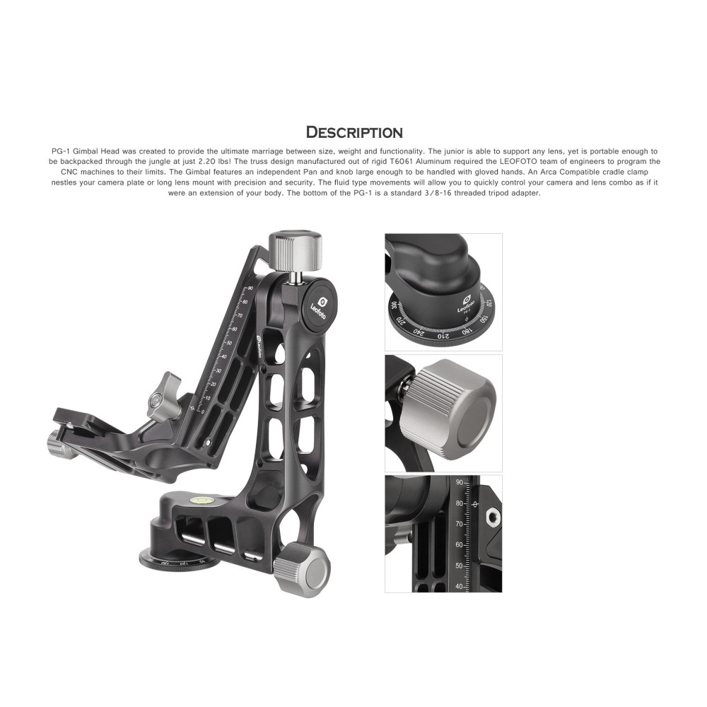 Hlava kategorie Gimbal - Leofoto PG-1 je kombinací optimální velikosti, nosnosti a stability. Je schopna poskytnout oporu pro kterýkoliv objektiv, přitom je stále dostatečně lehká a přenostitelná do kteréhokoliv přírodního prostředí, protože váží pouhých 1kg.