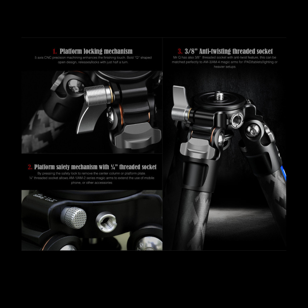 Stativová série Mr.Q je vrcholem evoluce stativů Leofoto v roce 2020. Ve své konstrukci nabízí kombinaci kompaktních rozměrů a vysoké užitkové vlastnosti série Leofoto Ranger a navíc přináší možnost integrace středového sloupku podobným mechanismem, jaký využívá série Leofoto Summit. Jednoduchým odjištěním a uvolněním mechanismu je možné sloupek buďto nasadit, anebo odstranit. Fotograf má tedy v případě Mr.Q možnost volit rovnou platformu stativu pod stativovou hlavou, anebo stativovou hlavu namontovat na středový sloupek. Systém montáže je prověřen, je rychlý, funkční a robustní.