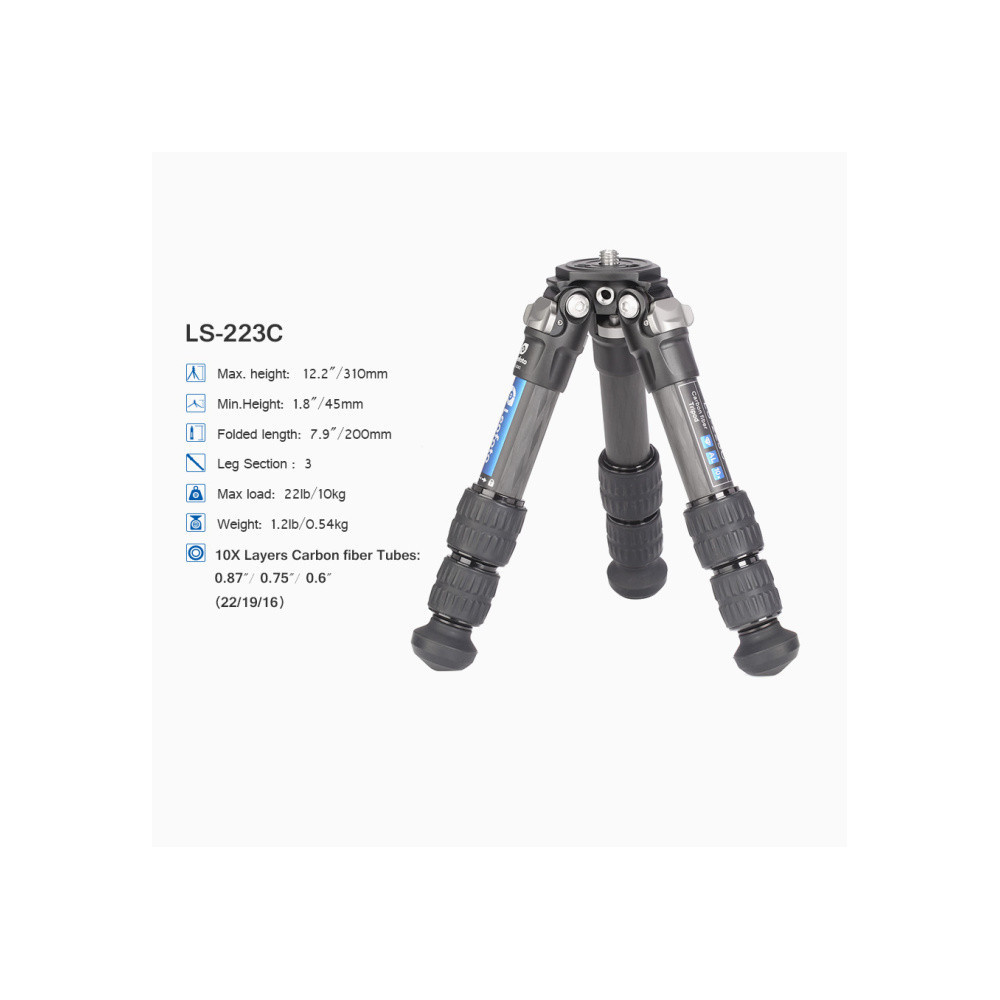Maximální nosnost stativu je 10 kg. To je ideální pro bezzrcadlovku, anebo pro DSLR s menším až středním teleobjektivem. Celá sestava je extrémně lehká. Karbonový stativ LS-223C váží 530 g. Je tedy dokonalým příslušenstvím pro cestování, třeba i do větší kapsy.