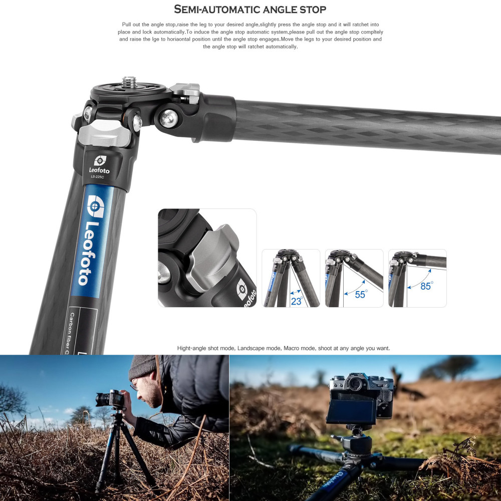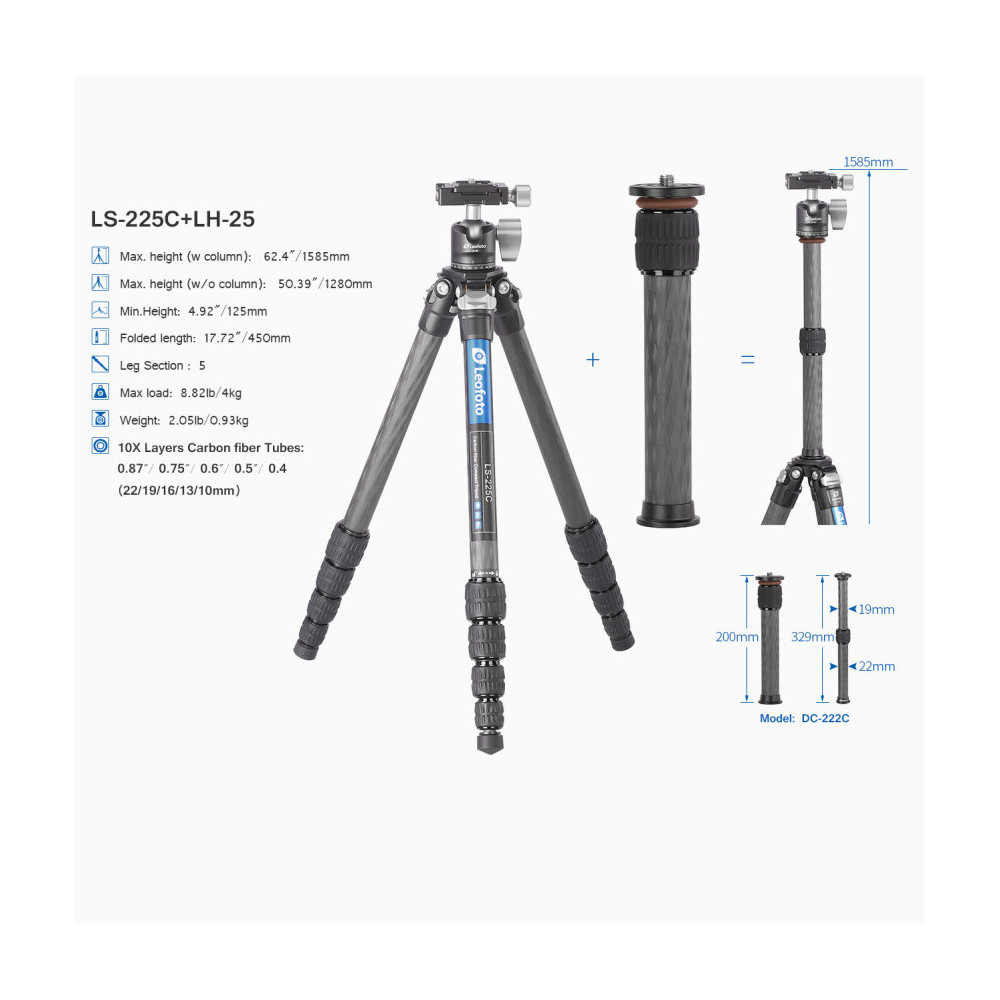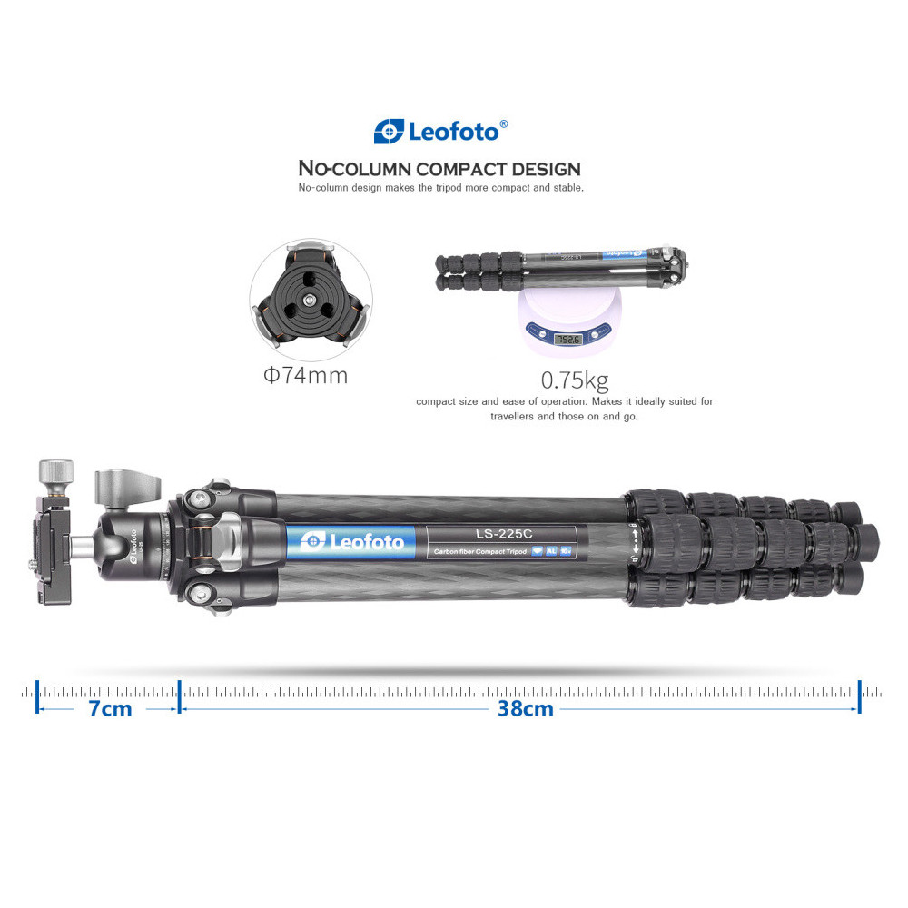 Lehký karbonový stativ Leofoto Ranger LS-225C je větším bratrem velmi kompaktního, do kapsy se hodícího stativu LS-223C. Jeho velikost ve sbaleném stavu je 450 mm. Je již větší, ale v žádném případě není nekompaktní. V rozbaleném stavu má stativ příjemných 1270 mm (bez středového sloupku). Stativ Leofoto Ranger LS-225C je připraven přímo k použití, protože je dodáván včetně kulové hlavy Leofoto LH-25, nastavitelným středovým sloupkem, víceúčelovým šikovným multifunkčním nástrojem a sadou hrotů z nerezavějící oceli. Maximální nosnost stativu a kulové hlavy je 4 kg. To je ideální pro bezzrcadlovku, anebo pro DSLR s menším objektivem. Celá sestava je velmi lehká, karbonový stativ LS-225C váží 758 g a kulová hlava LH-25 pouhých 172 g. Jsou tedy dokonalým příslušenstvím pro cestování.