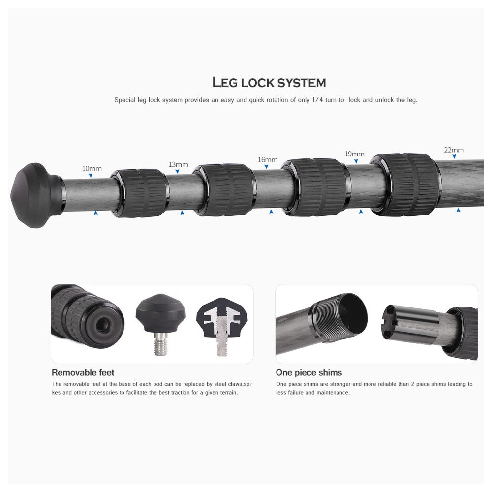 Někdy chcete být na cestě s minimálním fotografickým vybavením. Je proto výhodné, že lehký stativ nemá vestavěný středový sloupek. Je však součástí sady a pokud je potřeba, jednoduše jej nasaďte. Centrální sloupec v sadě zvyšuje pracovní výšku stativu Ranger LS-225C o 325 mm z 1170 mm na 1270 mm. Minimální pracovní výška stativu včetně je pouhých 130 mm - ideální pro makrofotografii těsně nad zemí. Nohy stativu sestávají z 5 segmentů, průměry trubek jsou 22, 19, 16, 13 a 10 mm. Samotný stativ má nosnost 4 kg.
