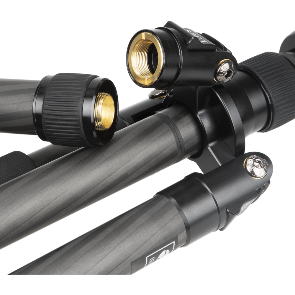 Nohy lze otočit směrem nahoru o 180 °, takže stativ při transportu vysoký pouze 47,3cm. Každá noha se skládá ze 4 částí a je opatřena třemi utěsněnými kruhovými zámky. Gumové nožičky umožňují, aby byl stativ stabilní na jakémkoli povrchu.